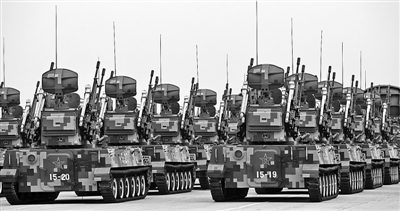 金水橋畔,天安門前,帶著一股誰與爭鋒的霸氣,某新型履帶自行高炮方隊緩緩駛來。