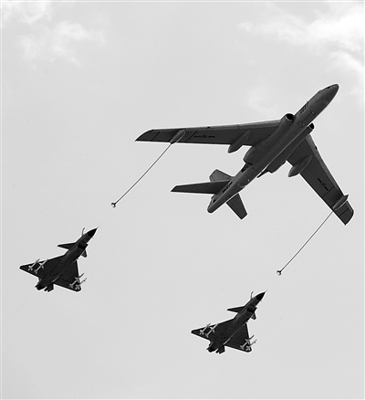 ●2008年10月,空中加油機成功實現同時為2架殲10飛機加油,標志著加油機部隊“隨時段升空、隨空域加油、隨機型加油”作戰能力的全面形成。