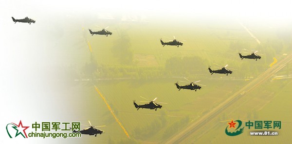 2015年9月3日,該旅9架某型國產武裝直升機列陣空中,由遠及近,依次飛過天安門城樓上空,接受習主席的檢閱。