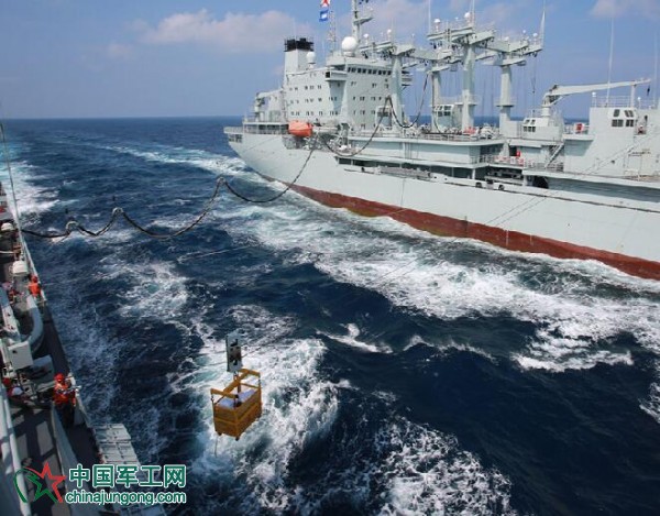 遠洋綜合補給艦青海湖艦采取橫向補給的方式,為??谂炑a給油料、淡水、干貨。