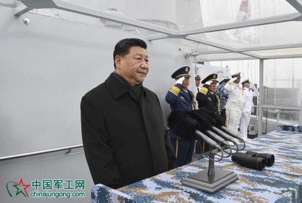 4月23日,在中國人民解放軍海軍70華誕之際,中共中央總書記、國家主席、中央軍委主席習近平出席在青島舉行的慶祝人民海軍成立70周年海上閱兵活動。圖為習近平檢閱艦艇編隊。新華社記者 李剛 攝
