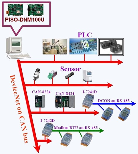 泓格公司的PISO-DNM100U產品不僅能讓您在最短的時間內學會控制DeviceNet設備,更能減少您開發DeviceNet系統的時間,建立更穩定的系統,以下將用圖型描繪出一個典型的網絡架構。