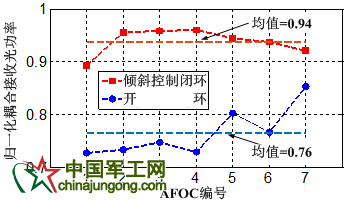 圖2 相控陣分孔徑在傾斜控制開、閉環下的光纖耦合接收效率實驗結果