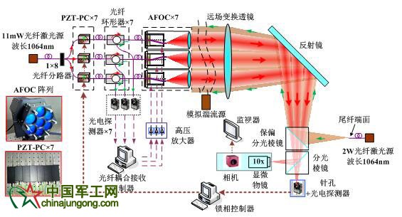 日前,中科院光電技術研究所自適應光學重點實驗室李新陽、耿超課題組在光纖激光相控陣技術研究方面取得新進展:以雙向收發的自適應光纖準直器為基礎模塊,構建了整體口徑100 mm的七單元激光收發陣列(光纖激光相控陣),于湍流環境下實現了光纖激光的相干組束和高效傳輸控制。該研究中,通過對信標光的分孔徑自適應耦合接收,實時校正各單元孔徑發射激光傳輸路徑上的波前傾斜像差;將以上方法與光纖激光陣列的主動鎖相控制結合,實現了室內模擬動態湍流下七單元激光束于遠場的相干合成。實驗中所用的核心像差校正器件—自適應光纖準直器(AFOC)和壓電光纖相位補償器(PZT PC)均為自適應光學重點實驗室課題組自行研制,并已獲得6項相關發明專利的授權。相關研究成果以李楓為第一作者發表于IEEE Photonics Journal 和 IEEE Photonics Technology Letters。