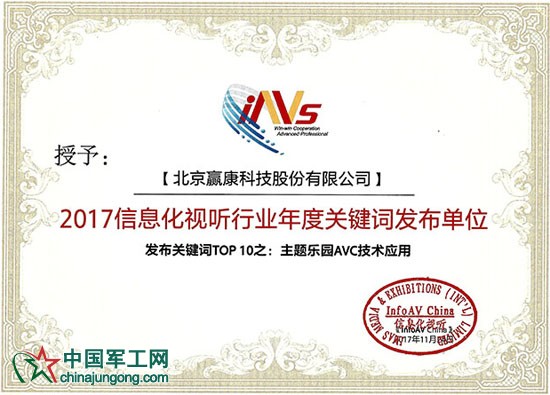 11月24日,在由專業音視頻行業媒體平臺《InfoAV CHINA》主辦的“2017年信息化視聽行業年度關鍵詞暨‘Best of the YeAR’榜單發布盛典上,贏康股份發布的“主題樂園AVC技術應用”被評選為2017視聽行業關鍵詞“TOP10”。