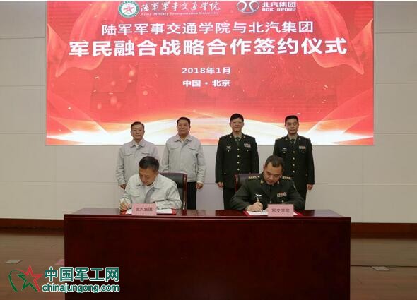 2018年1月10日,陸軍軍事交通學院與北京汽車集團有限公司在北京北汽集團總部簽署戰略合作協議,并舉行“陸軍軍事交通學院教學科研基地”揭牌儀式。陸軍軍事交通學院院長李明少將,北汽集團黨委書記、董事長徐和誼,以及雙方相關部門領導、專家出席活動。簽約儀式上,雙方介紹了院校、企業的基本情況和發展戰略,交流了輕型越野平臺、智能汽車等領域研發方面取得的最新成果,明確了雙方戰略合作的主要方向和重點內容,確立了院企長期合作、共謀發展的戰略伙伴關系。