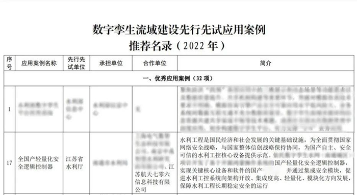 近日,水利部公布《數字孿生流域建設先行先試應用案例推薦名錄(2022年)》,航天科工二院七〇六所江蘇公司與合作單位聯合申報的“全國產輕量化安全邏輯控制器”成功獲評優秀應用案例。
