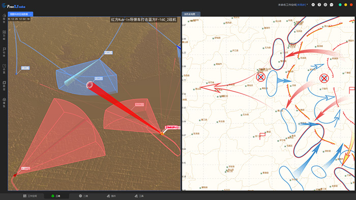綜合態勢顯示系統(FreeXGIS Situation)基于FreeXGIS Desktop研發,涵蓋了海陸空天電網綜合態勢顯示的二次開發與應用,具有想定編輯、戰場態勢環境構建、數據接入、過程模擬、推演過程記錄及回放等功能??赏ㄟ^控制場景、兵力、顯示、視角等,構建三維數字化戰場環境,實時展現出對抗雙方兵力和作戰行為,為綜合態勢分析、評估、優化提供依據。