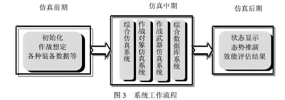 其中:仿真前期包括初始化、作戰想定設定、數據庫管理等;仿真后期包括狀態顯示、態勢推演過程與仿真結果顯示、分析評估結論等;仿真中期主要由綜合仿真系統構成、作戰對象仿真系統、我軍作戰武器裝備仿真系統和綜合數據庫等組成,用于完成電子對抗運用的綜合仿真運行、計算與處理等。