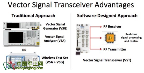 矢量信號收發儀(VST)是一類全新的儀器,它結合了矢量信號分析儀(VSA)、矢量信號發生器(VSG)與基于FPGA的實時信號處理和控制。NI的全球首臺VST還擁有用戶可編程FPGA,它允許自定義算法直接用于儀器的硬件設計。這種軟件設計的方法讓VST擁有了軟件定義無線電(SDR)架構的靈活性以及射頻儀器的高性能。圖1(下圖)展現了傳統射頻儀器和VST軟件設計方法之間的差異。