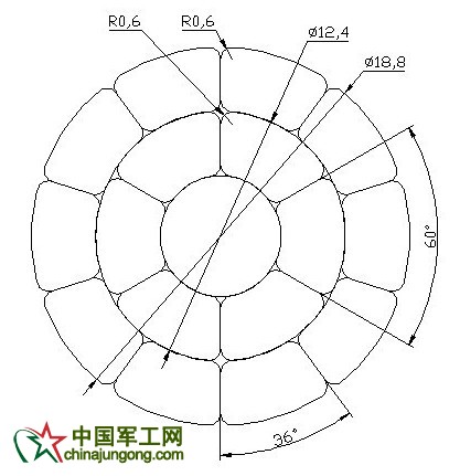 復合芯的直徑為6.0mm,則內層鋁層直徑為(18.8+6.0)/2=12.4mm。利用AUTOCAD進行圖形繪制,由于內層型線是6根,則型線圓心角為60°,如圖2所示: