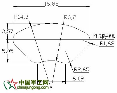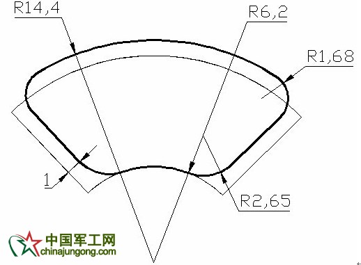 考慮到線芯擠絕緣時,絕緣厚度的影響,故應將瓦形兩側邊應內各移動1.0 ,然后將底弧圓角半徑 ,兩側弧圓角半徑 代入,再將外圓弧向上移動1.0 (估計值,根據經驗,以后要調整的),如下圖(粗線部分)