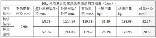 10kv光電復合架空絕緣電纜結構對照表(1km)
