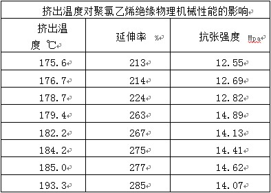 溫度對產品的物理性能影響是復雜的,電纜用乙烯類塑料絕緣層抗張強度與擠出溫度有關,對應于最大的抗張強度有一最佳的擠出溫度,有關實驗結果如表1