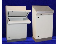 ,兩段式進線底板,鍍鋅安裝板,專用拉桿三點式帶滑輪雙齒鎖。琴式操作臺分為三段式,上部可安裝觸摸屏或顯示單元,中部安裝按鈕指示燈及通用儀表單元,下部安裝電氣元件單元,上段下段鍍鋅安裝板,可前后開門,聚氨脂密封條。