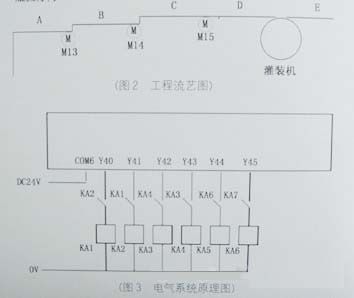 根據工藝要求,灌裝機前面的輸送帶分成若干段。A、B、C、D、E為輸送帶,M13、M14、M15分別為A、B、C帶的托動電機。D帶與灌裝機機械聯動,E帶由另一電機托動。另外,各帶上均有光電傳感器測瓶流速度。PLC根據平流調整各端傳送帶的速度。
