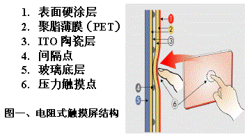 圖一是電阻觸摸屏的一個側面剖視圖。手指觸摸的表面是一個硬涂層,用以保護下面的PET層。PET層是很薄的有彈性的PET薄膜,當表面被觸摸時它會向下彎曲,并使得下面的兩層ITO涂層能夠相互接觸并在該點連通電路。兩個ITO層之間是約千分之一英寸厚的一些隔離支點使兩層分開。最下面是一個透明的硬底層用來支撐上面的結構,通常是玻璃或者塑料。