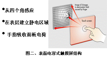 表面電容觸摸屏只采用單層的ITO,當手指觸摸屏表面時,就會有一定量的電荷轉移到人體。為了恢復這些電荷損失,電荷從屏幕的四角補充進來,各方向補充的電荷量和觸摸點的距離成比例,我們可以由此推算出觸摸點的位置。