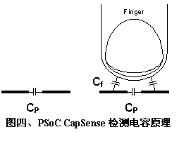 PSoC CapSense技術是根據電容感應的原理使用CSA或CSD模塊來實現的。PCB板或觸摸屏上相鄰的感應模塊或導線之間會存在寄生電容(見圖四中的Cp),當有手指接近或觸摸兩個相鄰感應模塊時,相當于附加了兩個電容,它們相當于并聯在Cp上的電容Cf。利用PSoC的CSA和CSD技術可以檢測到這個電容上的變化,從而確定有沒有手指觸摸。