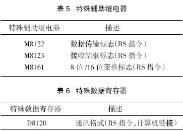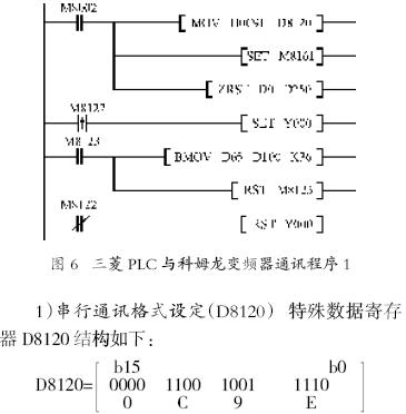 4 三菱PLC與科姆龍變頻器的通訊說明 下面介紹如何利用三菱PLC 的RS 指令對KV2000變頻器進行通訊控制,具體的RS指令說明請參照三菱公司《FX通訊手冊》第九章關于RS指令的介紹。 4.1 特殊輔助繼電器 特殊輔助繼電器如表5所列。 4.2 特殊數據寄存器 特殊數據寄存器如表6所列。 4.3 通訊格式(D8120) 通訊格式(D8120)如表7所列。 通訊格式決定RS 指令和變頻器通訊時的通訊設置(數據長度、奇偶校驗位和波特率等),根據變頻器的通訊設定來設置D8120,設置好D8120 參數后,PLC要斷電一次,后再通電,以確保參數寫入。