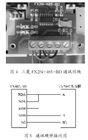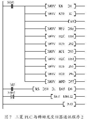 4.4 三菱PLC擴展RS485通訊模塊 RS485 串行數據通訊接口,在三菱FX2N 系列PLC 上擴展一個RS485通訊模塊,型號為FX-485-BD,如圖4 所示。三菱PLC 與科姆龍變頻器通訊的硬件接線原理圖見圖5。 5 PLC讀取變頻器參數程序范例 在設計軟件方面,首先對變頻器通訊環境進行參數設置,包括地址、波特率、奇偶校驗等。然后,根據變頻器的通訊協議(詳見本文第1 節),運用三菱可編程控制器的串行數據通訊RS指令,設計出PLC對變頻器實行控制的梯形圖程序,如果系統配有觸摸屏(人機界面),可將觸摸屏的軟件設計也納入對變頻器的監控中,限于篇幅的原因,人機界面的內容在這里不再描述。