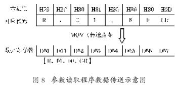 結合表7 內容,串行通訊設定為波特率19 200,偶校驗,7位數據長度,1位停止位。 2)8 位/16位變換標志(M8161) 當M8161 OFF時,16 數據被分為高8 位和低8 位,然后發送或接收。當M8161 ON時,高8位被忽略,只有低8位被視為有效。上述程序設的是8位模式。 3)數據傳輸標志和接收結束標志(M8122 和M8123) M8122是數據傳輸標志,當發送完成時,此請求自動復位,不要用程序復位此請求。接收完成標志M8123不能在一個連續的程序中復位。 5.1.2 通訊程序2主要功能解說 通訊程序2如圖7所示。 RS 指令用RS232 端口選用設備來發送和接收串行數據。在本范例中,它規定了從可編程控制器發送數據的首地址(D50)和點數(D1),還規定了接收數據的存儲首地址(D65)和最大可接受的點數(D0)。 根據參數讀取命令【R,uu,nn】,由十六進制與代碼對照表中得知,傳送給D50、D51、D52、D53、D54、D55、D56、D57的數據分別是【R,01,60 CR】,如圖8所示。則表示PLC讀取第1臺變頻器的F060參數(F060表示變頻器輸出電壓)。