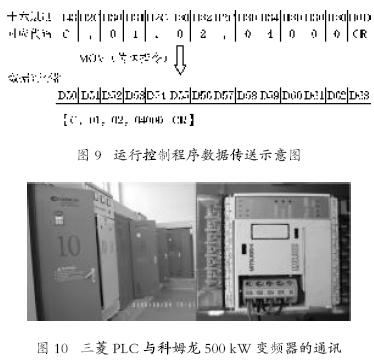 5.2 設定頻率和運行方向的程序 根據運行控制命令,由十六進制與代碼對照表中得知,當程序傳送【H43,H2C,H30,H31,H2C,H30,H32,H2C,H30,H34,H30,H30,H30,H0D】時,傳送的代碼是【C,01,02,04000CR】,如圖9 所示,表示第1 臺變頻器以40 Hz 的頻率進行正轉運行,程序略。 5.3 PLC與變頻器RS485通訊的特點 1)僅通過一條通訊電纜連接,無須其他外部接線,見圖10; 2)幾乎完成傳統應用的所有功能; 3)能進行內部的數據通訊,非常方便地從變頻器中獲取所驅動的電動機各種電參數如:運行頻率、電流、電壓、功率等,配以人機界面,則直接顯示上述 電參數; 4)通過人機界面或上位機等可對變頻器的參數進行設置或修改; 5)普通變頻器最多32臺掛在RS485總線上,而科姆龍變頻器則可以實現最多99 臺掛在RS485 總線上。實現PLC 對變頻器的集散式遠程控制(其對多臺變頻器同步運行控制效果尤為理想)