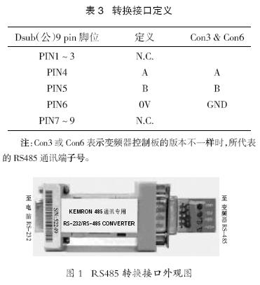 0 引言 科姆龍變頻器作為節能、環保的高新技術產品,而被推廣并應用。隨著KV2000 無感矢量變頻器的應用越來越廣,用戶經常會用到變頻器RS485通訊功能,例如變頻器與PLC 或其他上位機進行的通訊。作者憑多年的工作實踐與經驗,對變頻器RS485通訊有獨特的理解和體會,今天有機會把它整理出來,希望對從事自動化領域,尤其是變頻器應用領域的工作者有所幫助。在此特別鳴謝福建泉州的王華安總經理在寫作過程中給予的幫助與支持。 1 KV2000變頻器RS485介紹 1.1 RS485通訊端口參數 科姆龍KV2000 無感矢量變頻器RS485 通訊端口參數,在通過電腦及其他上位機進行通訊控制時,F093用來指定本變頻器的通訊地址、通訊格式和通訊速率,其參數設定格式為F093=PB.ID 其中: P為通訊格式,設定說明見表1; B為通訊速率,設定說明見表2; ID為通訊地址,設定范圍為ID=01~99。 1.2 RS485硬件介面規格 變頻器與電腦通訊時,可轉換為標準的9 pinDsub(公)電腦接頭。轉換后的定義見表3。RS485轉換接口外觀見圖1。 RS485 介面可允許多臺變頻器的相應信號端子直接并聯。