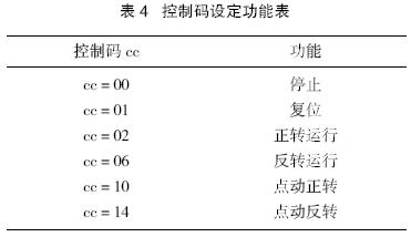 1.3 KV2000通訊格式 1.3.1 對變頻器的命令 經由RS485 介面與變頻器之間的信息溝通都是ASCII碼字串,結尾須加CR 符號(0x0D)。電腦的通訊端口必須定義為7Bit data,Even Parity 1)運行控制命令(變頻器無回復資料) 命令格式 【C,uu,cc,fffff】 其中:C為運行控制命令的起始字元。 uu 為通訊地址,指定第uu 臺接收本字串。uu(ID)可指定為第00~99臺。若uu=00,則所有的變頻器都必須接受命令。 cc為十進制運行控制命令代碼(00~15)。由四個二進制信號組成,設定見表4。 fffff為速度設定值。