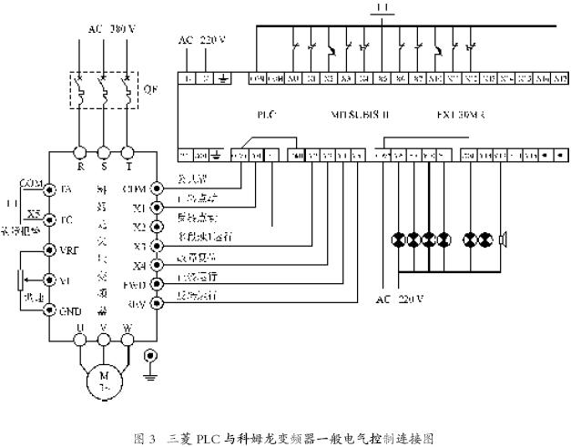 3 運用可編程控制器PLC 對變頻器的常規控制 3.1 PLC接受的變頻器輸出參數 如圖3所示,變頻器的運行信號,報警輸出,頻率到達,轉速輸出,AM 模擬量輸出等參數輸入到PLC 的輸入點和D/A、A/D轉換模塊。 3.2 變頻器接受的PLC輸出的控制參數 1)PLC 輸出點控制變頻器的運行和停止; 2)PLC 輸出點控制變頻器多段速度運行; 3)PLC 輸出點控制變頻器的故障復位; 4)PLC 的D/A或A/D模塊輸出給定變頻器的運行頻率。 3.3 常規應用方式的缺點 1)不能進行內部數據的傳遞; 2)占用了PLC 較多的輸入/ 輸出點,且還需要添加D/A轉換和A/D轉換特殊功能模塊,這種控制模式極大地增加了變頻器的控制成本; 3)變頻器必須進行繁瑣的控制線路的配線(如圖3 所示),使得變頻器的運行穩定性降低,變頻器維護和故障排除變得困難。如果幾臺變頻控制電機要進行同步運行,很明顯,這種控制模式就更加難以滿足需求。
