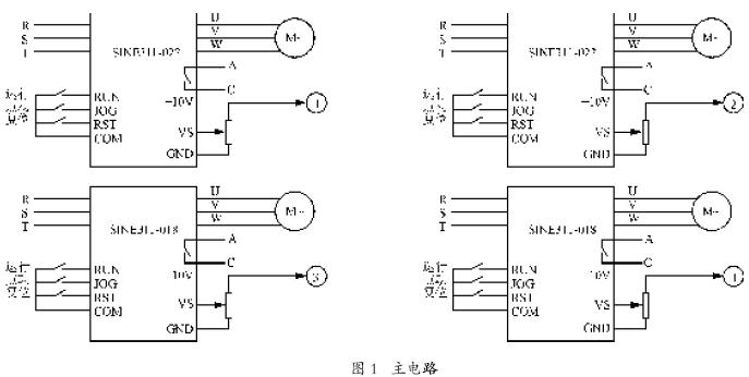 控制電路如圖2所示。正常使用時,變頻器分別由各自的控制元件啟動。變頻器按照設置的運行加速時間運行,運行過程中根據每個轉輥的實際帶載情況,可以通過各自的微調電位器對各自的VS給定電壓進行調整,從而改變變頻器的運轉頻率;也可以通過主同步電位器同時對4 臺變頻器進行VS 端子電壓調整,從而改變所有變頻器的運轉頻率,將實現4臺電動機的轉速聯動且穩定運行;異常的情況下,任何一個變頻器故障報警輸出的信號都將同時對所有的變頻器進行報警互鎖,自由停車,最大限度地減少了電子元器件的損壞和對機械件的嚴重破壞。