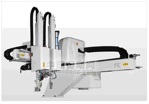 本文所述機械手是成型機專用的機械手,這種機械手在市場上按照驅動類型主要分為兩種類型:一種是有氣動元件驅動的只是單純的作低速點對點的運動控制的低端的機械手;而另一種就是要采用高性能伺服作為驅動元件的作高速精確定位的高性能機械手。在第二種機械手上面采用了臺達伺服設計,是本文討論的對象,如圖1所示。伺服在這種機械手上的應用有很多與一般伺服應用場合的不同之處,之前客戶使用的是其它伺服技術,研發結果表明臺達伺服技術在本項目能夠達到更高的性能指標,同時又能降低客戶的成本,提高其產品的性價比。