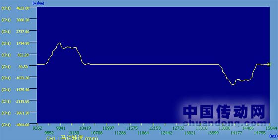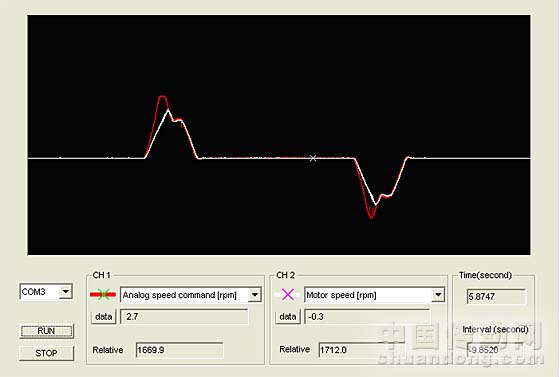 圖3、圖4兩條曲線是ASD-A伺服調試軟件抓取得實時曲線,在這樣的運行情況,伺服的運行并不平穩,伺服的運行情況是,在加速時電機會出現高速加速,伺服以1600rpm速度運行,在運行到中間時伺服會出現一個明顯加速過程,伺服的運行速度在1000rpm左右,這樣的運行情況是無法滿足客戶的要求的!