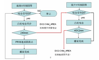 垂直跟蹤 Y軸的CAPTURE信號DI7就是接到水平跟蹤X軸的D02:CAM_AREA信號觸發凸輪嚙合的,噴嘴輸液泵的開啟也是通過Y 軸的D02:CAM_AREA信號來控制的。因為只有水平跟蹤X軸和送瓶主動軸同步后,垂直跟蹤Y軸才能下降,將噴嘴插入瓶口。