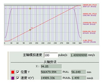其中虛線為模擬器產生的主動軸速度曲線,實線為X水平跟蹤軸的速度曲線。當移動光標,使用者就可以在軟體上清楚地觀察到主動軸模擬速度(即,送瓶伺服的速度)和從動軸速度(即XX水平跟蹤軸)。