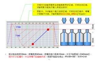 在灌裝過程時,不論在快速插入瓶口和返回區間Y軸始終和主動軸的編碼器命令同步對應,同樣伺服馬達的速度和藥瓶的輸送速度保持一致,即為同步灌裝要點!