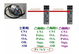 By-pass命令傳遞功能是A2智能伺服的另一大功能特色,利用By-pass功能,主動軸編碼器信號(脈沖命令信號)輸入到其他從動軸CN1,依次串接多顆伺服。即一主軸指揮多從軸同動。