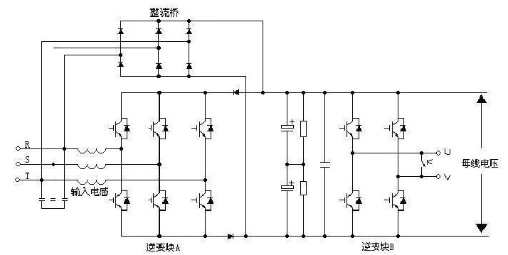 每個功率單元結構上完全一致,可以互換,其主電路結構有圖2所示,為基本的交-直-交雙向逆變電路。圖中通過整流橋進行三相全橋方式整流,整流后的給濾波電容充電,確定母線電壓,通過對逆變塊B中的IGBT逆變橋進行正弦PWM控制實現單相逆變。當電機進入發電狀態后,逆變塊B中的二極管完成續流外,又起全波整流,使能量能夠轉移到濾波電容中,結果母線電壓升高,達到一定程度后,啟動逆變塊A,進行SPWM逆變,通過輸入電感,返回到移相變壓器的次極,通過變壓器將能量回饋到電網。