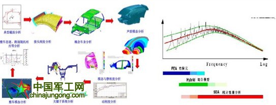應用領域在汽車火車飛機等交通工具方面,客戶對聲音品質及舒適性的訴求成為當前設計方案中的重要技術要求。目前,車身的NVH性能開發已廣泛利用CAE工具,通過仿真,大大降低了開發成本,縮短了開發周期,提高了NVH開發的精確性。對車身低頻NVH問題主要利用有限元和邊界元,中頻問題可采用有限元發和實驗結合的混合模型法,利用統計能量法可分析高頻問題。通過對車身NVH性能進行仿真分析,可以在設計開發前制定產品設計方案,避免后期傷筋動骨的修改,節約開發成本,提升產品工藝。